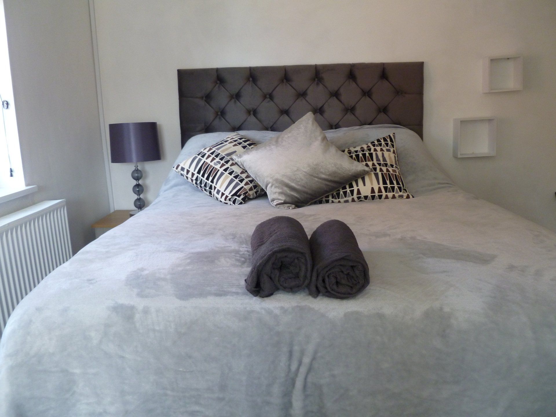 The bedroom includes one King size bed, fresh linen, bedside tables, hairdryer and fully fitted wardrobes. The en-suite bathroom includes both shower and bath facilities, towels shower gel, shampoo, conditioner and anti-bacterial hand wash gel. There is also a smoke alarm.